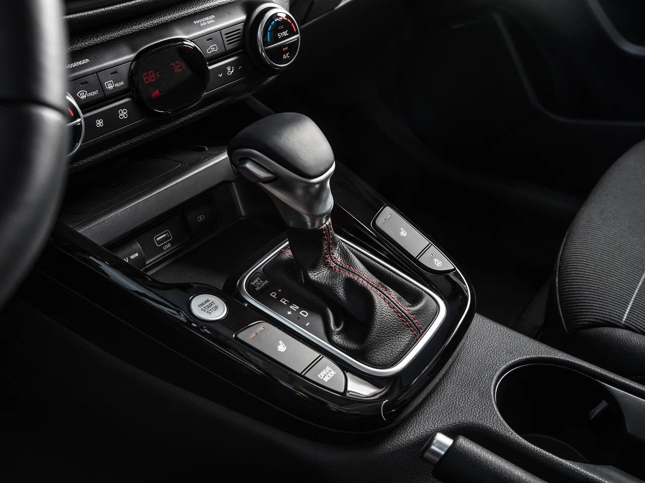 - Комбинированная отделка сидений из кожи и ткани с красной прострочкой